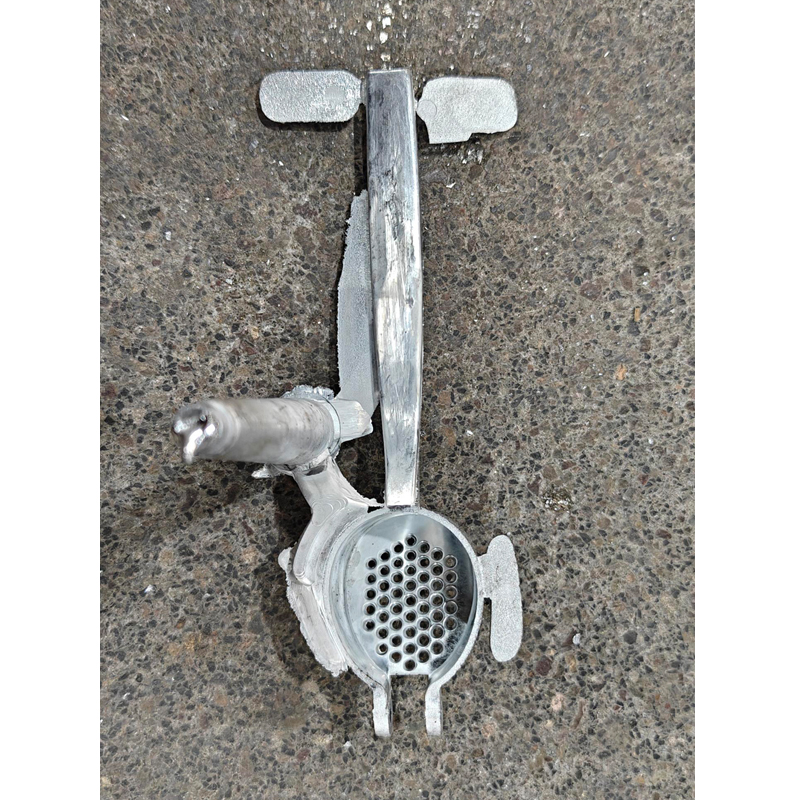 Снимка 1 показва състоянието на грубо отливане на пресата за чесън. След като е подложена на груба механична обработка, тя се полира ръчно. След това на Снимка 3 е изобразена частта след обработка чрез 180-градусова високотемпературна автоматизирана производствена линия за галванично покритие. Накрая квалифицираните компоненти се сглобяват.