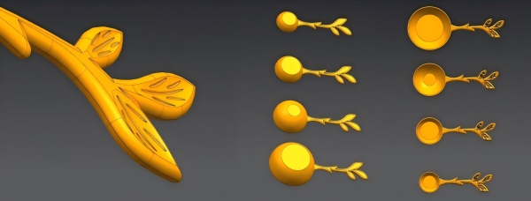 Първо, включваше оценка на формата на продукта и потенциалната употреба въз основа на предишен опит. Използвайки цинкова сплав като основен материал, ние изчислихме плътността на материала и характеристиките на повърхността, включихме ергономичността и проектирахме общите размери за четирите мерителни лъжички или лъжички за лед. Впоследствие усъвършенствахме всяка крива, ъгли на R-радиус и други дребни детайли въз основа на тези размери.